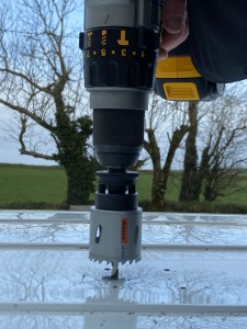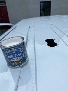 We bought the wind powered Roof Vent from Vanguard and it came with very easy installation instructions and a template for drilling the holes and the large vent hole. For this step we needed: A drill, a hole saw attachment, Hammerite, Silicone and of course the Rood Vent itself.