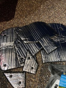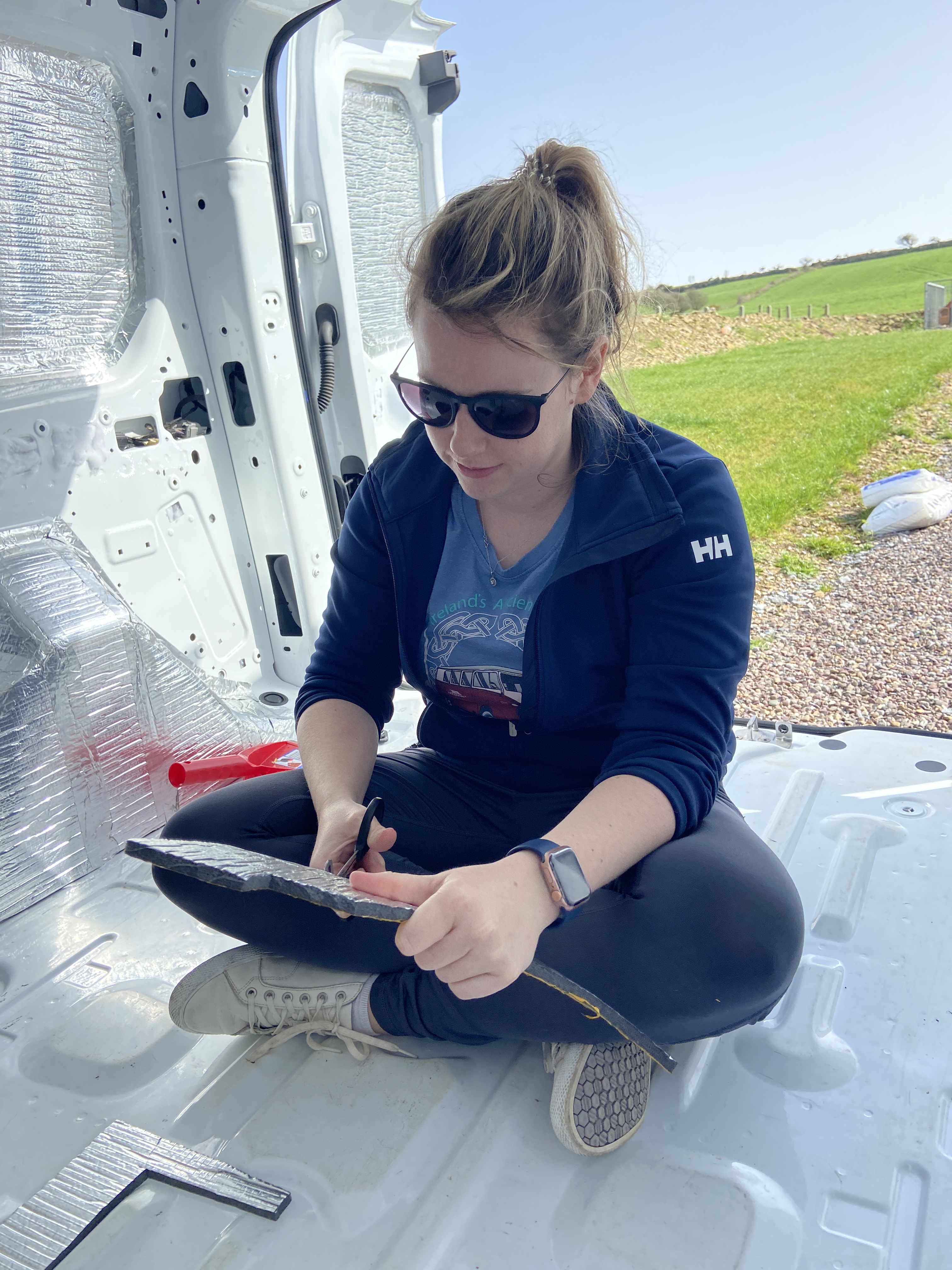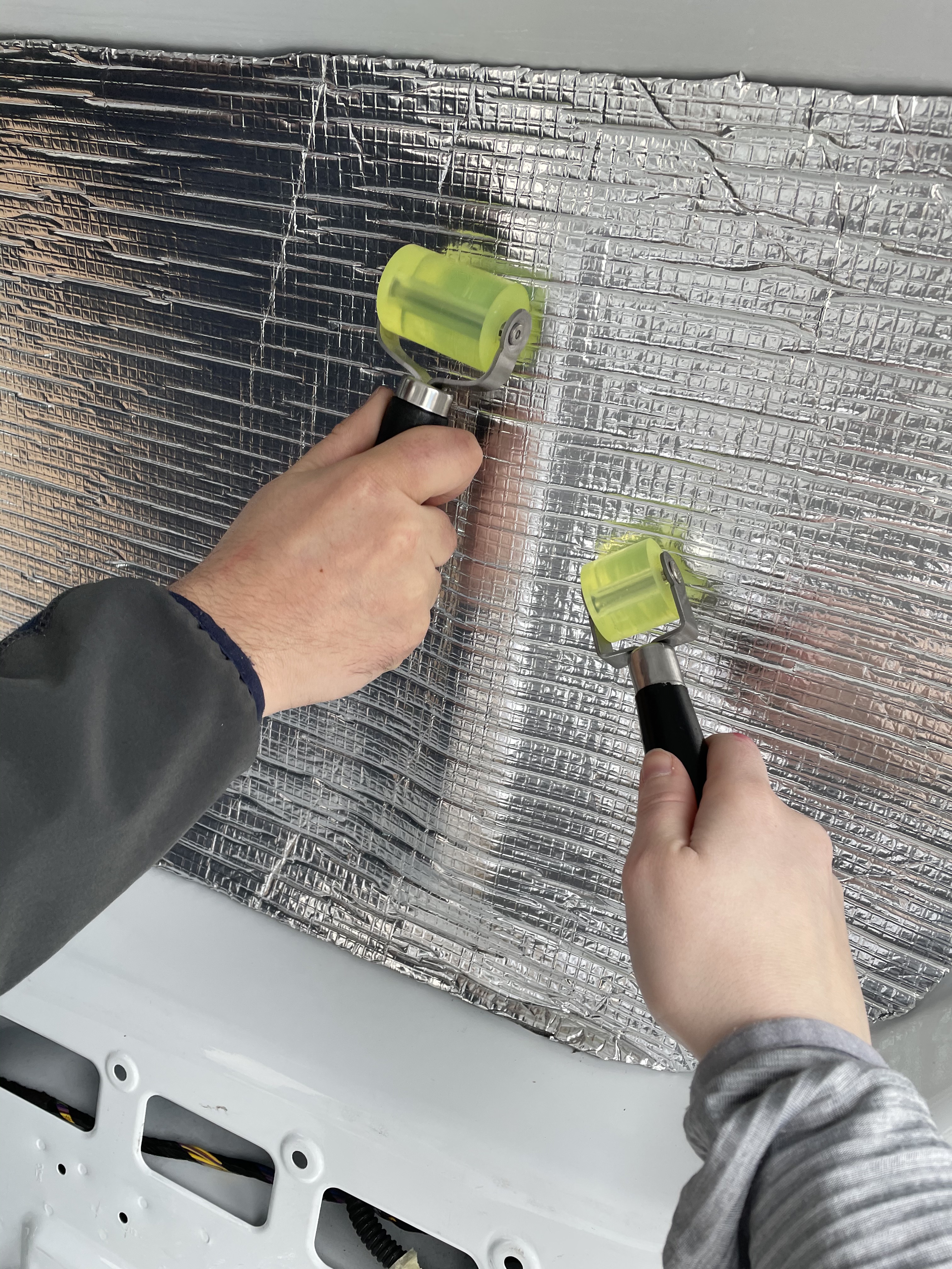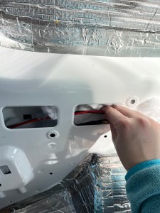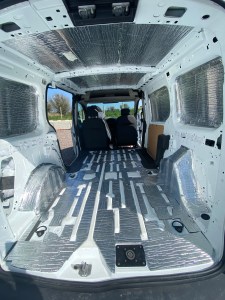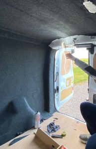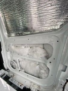 For the many void spaces in the van’s bodywork we used recycled plastic insulation from B&Q. This was inexpensive and easy to work with, as an added bonus, it’s better for the environment. We used high temperature spray adhesive to secure any insulation around door mechanics, this was to avoid anything jamming later on.