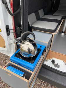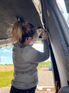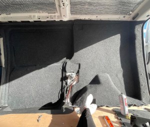 There wasn’t much debate about what colour carpet we wanted, we both quickly decided on Anthracite four-way stretch from Cosy Campers in Dublin. We quickly learned that we should have ordered more than we thought we needed so a second order was made not long after the first one arrived. Again, this was definitely a two person job. While one person was holding the carpet in place, the other treated both the carpet and the panel with High-temperature spray adhesive. Then the carpet had to be pulled taut and stretched into position, rounding any curves or obstacles. While quite labour intensive it was an enjoyable process and completely transformed the look and feel of the van, it was now starting to look more like a camper.