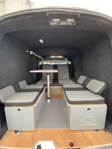 We discovered Errigal Campers had a Camping Module, a small compact camping kit that was made especially for small vans. It folded down to small size when not in use and within minutes it could go from a seated table area to a double bed. The price of the Camping Module was €1295.