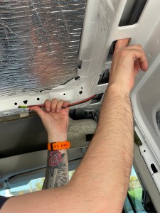 This was a very daunting task for me personally, luckily, my partner Cian is an electronic engineer and had some experience in the area. After a lot of research we decided on what we needed (and what we really didn’t) and purchased a Voltage Sense Relay (VSR) kit, a switch panel with USB and 12V charging and some temporary LED strip lighting. Cian sourced a 12V Leisure battery, cabling and connectors. Running the cables through the void spaces was definitely a two person job. The most difficult task of this stage was connecting the VSR to the van’s battery which would allow the leisure battery to be charged while driving. This involved running a cable through the firewall between the cabin and the engine bay. After a few hours of expletives and some cuts and bruises, it was a success. All that remained was to terminate all the cables.